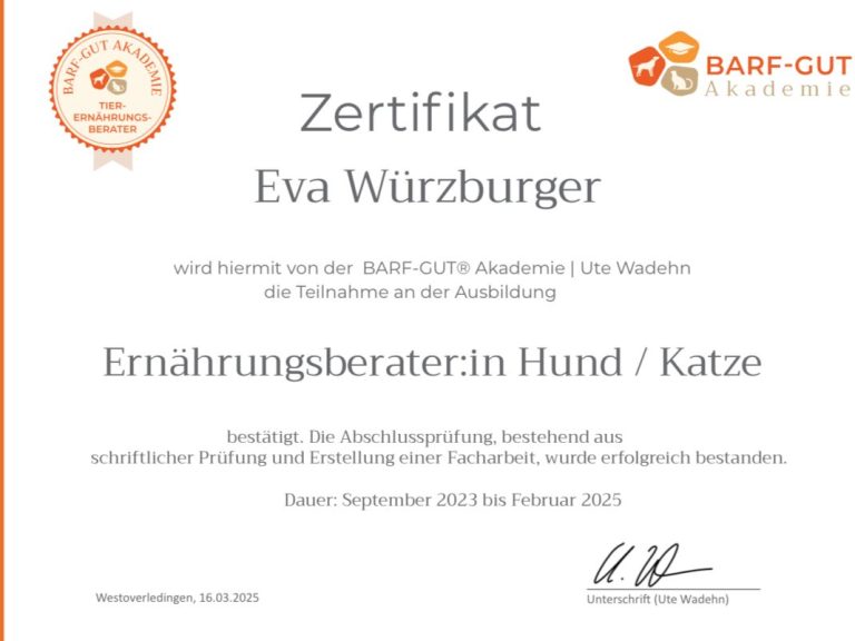 - 2023-2025 Ausbildung zur Ernährungsberaterin für Hunde und Katzen an der Barf Gut Akademie